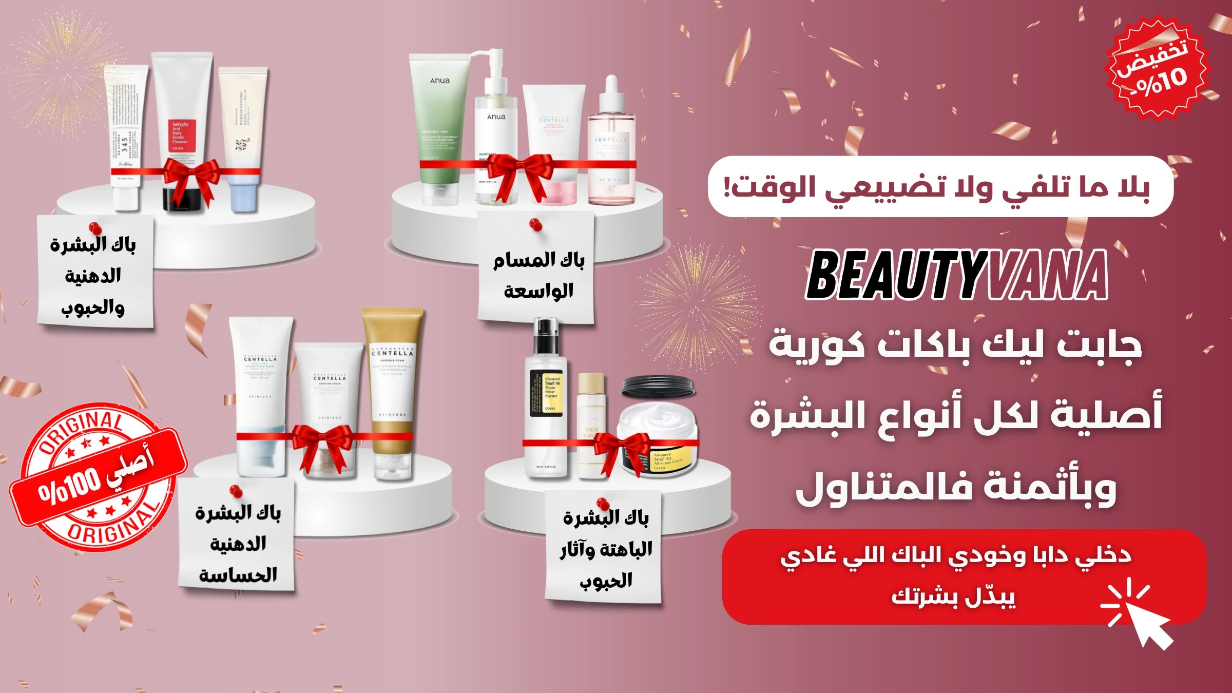Chez BEAUTY VANA, notre mission est simple : vous offrir des produits de beauté coréens 100% authentiques, importés directement pour vous. Nous croyons que tout le monde mérite des soins de qualité à des prix abordables. C’est pourquoi nous travaillons dur pour rendre ces marques accessibles à tous nos clients au Maroc, avec une livraison rapide et des prix doux.